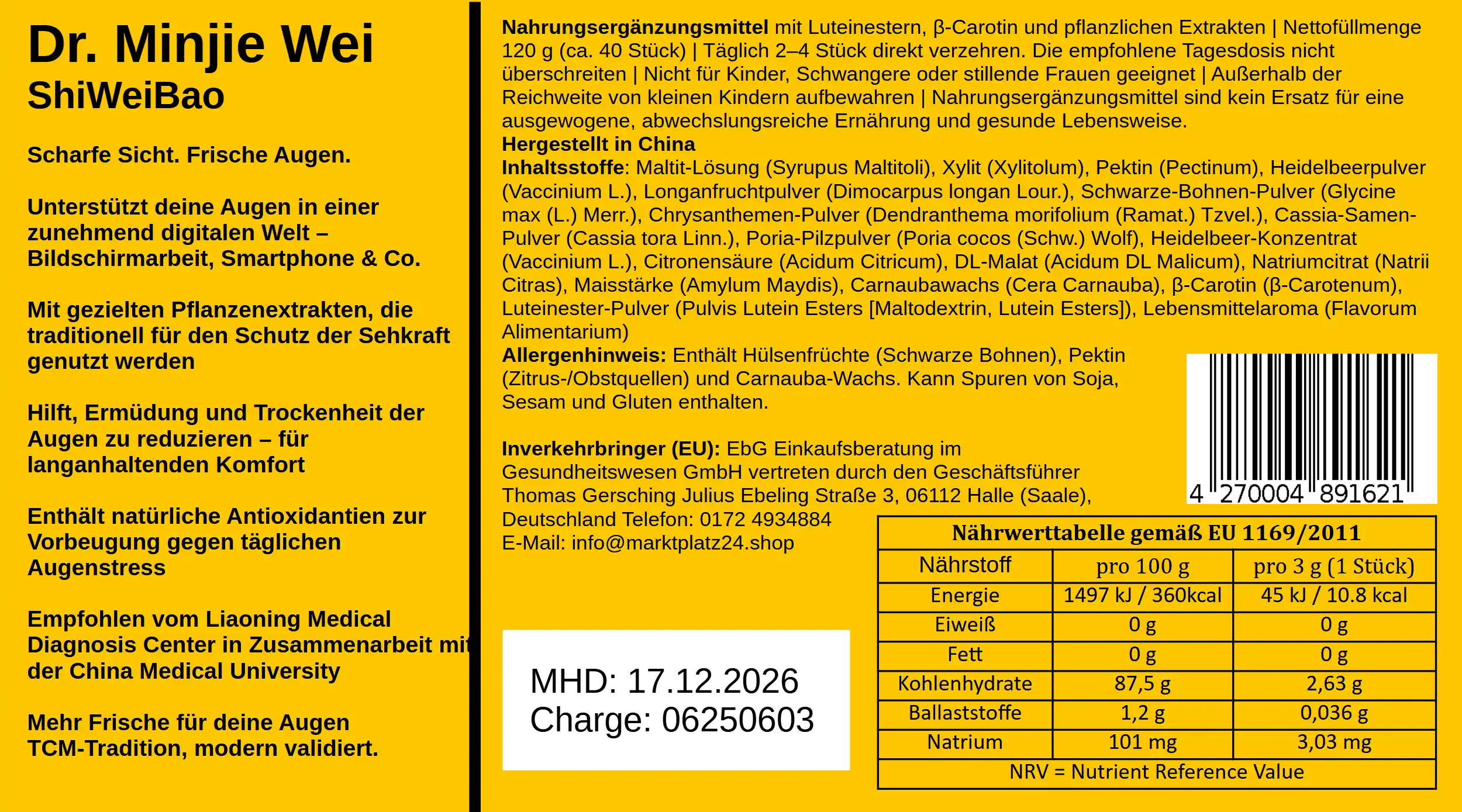 ShiWeiBao hat mit acht Komponenten die kompakteste Architektur der Produktlinie. Das ist eine Stärke: Jede Zutat trägt ohne Redundanz – und die Rezeptur ist auf zwei komplementäre Ziele ausgerichtet, die sich gegenseitig bedingen: Schutz (Heidelbeere, Chrysantheme, Cassia, Carotinoide) und Nährung (Longan, schwarze Bohnen, Poria).